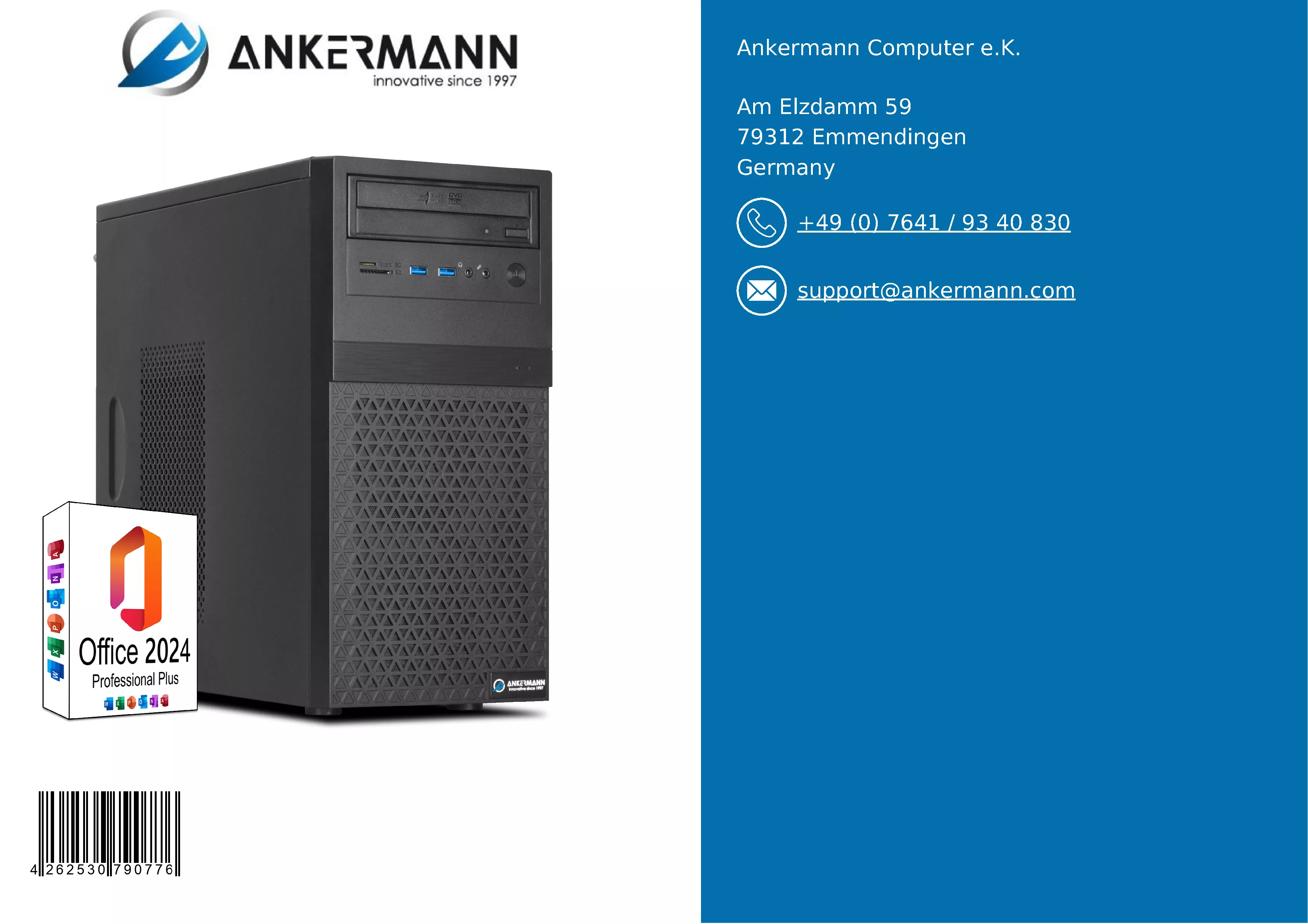 - El servicio de Ankermann le ofrece una garantía de 24 meses y muchos años de experiencia en la fabricación y venta de PC en Alemania y Europa. Un servicio de devolución en caso de reclamación de garantía y una atención al cliente rápida y amable son algo natural para nosotros.
