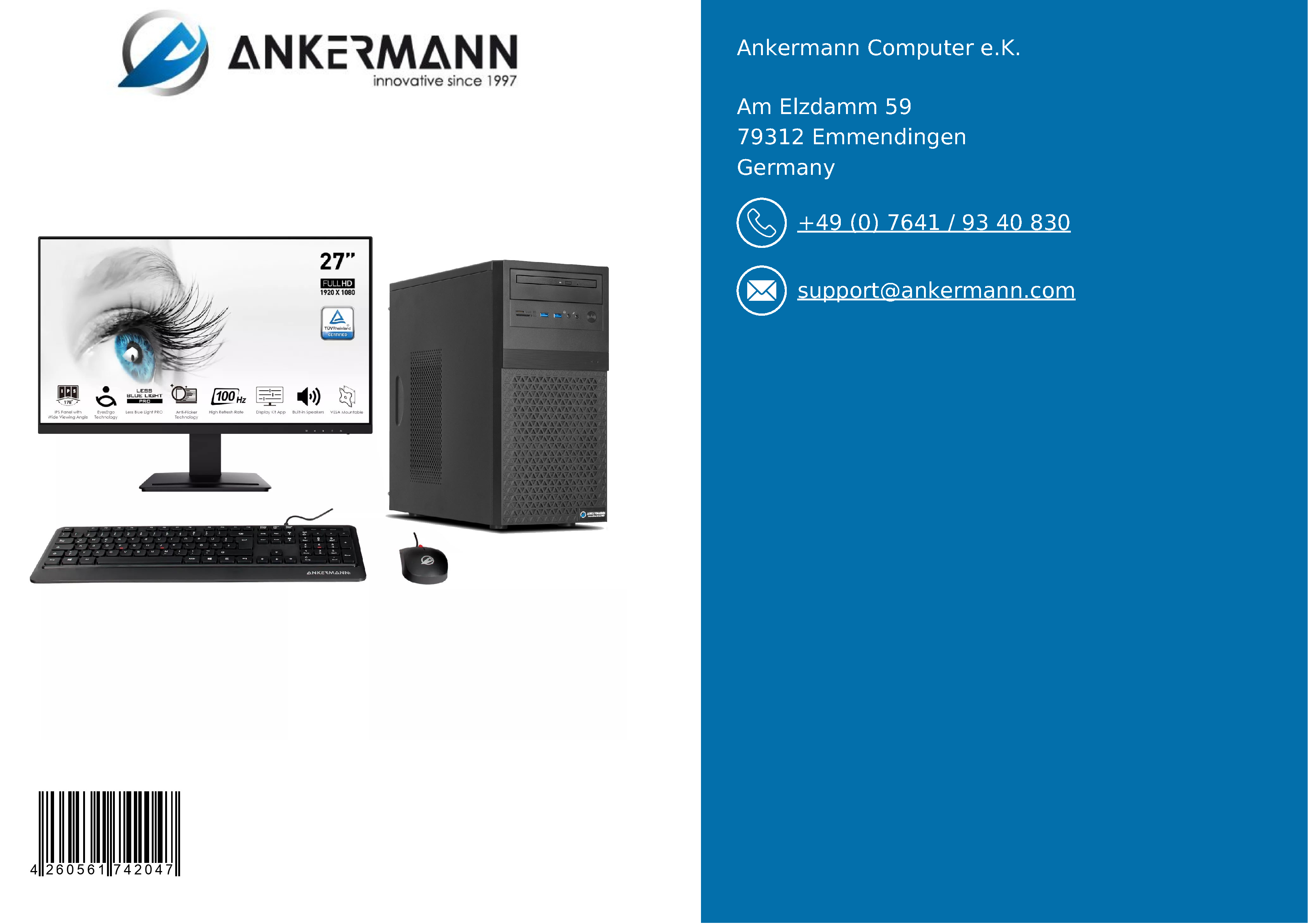 - El servicio de Ankermann le ofrece una garantía de 24 meses y muchos años de experiencia en la fabricación y venta de PC en Alemania y Europa. Un servicio de devolución en caso de reclamación de garantía y una atención al cliente rápida y amable son algo natural para nosotros.