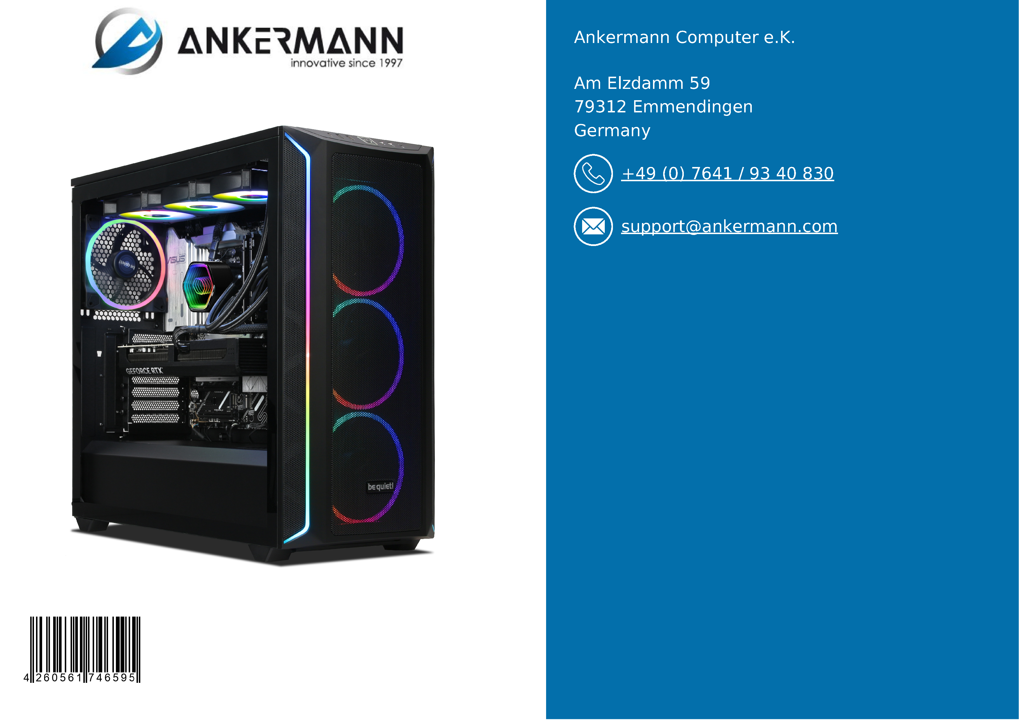 - El servicio de Ankermann le ofrece una garantía de 24 meses y muchos años de experiencia en la fabricación y venta de PC en Alemania y Europa. Un servicio de devolución en caso de reclamación de garantía y una atención al cliente rápida y amable son algo natural para nosotros.