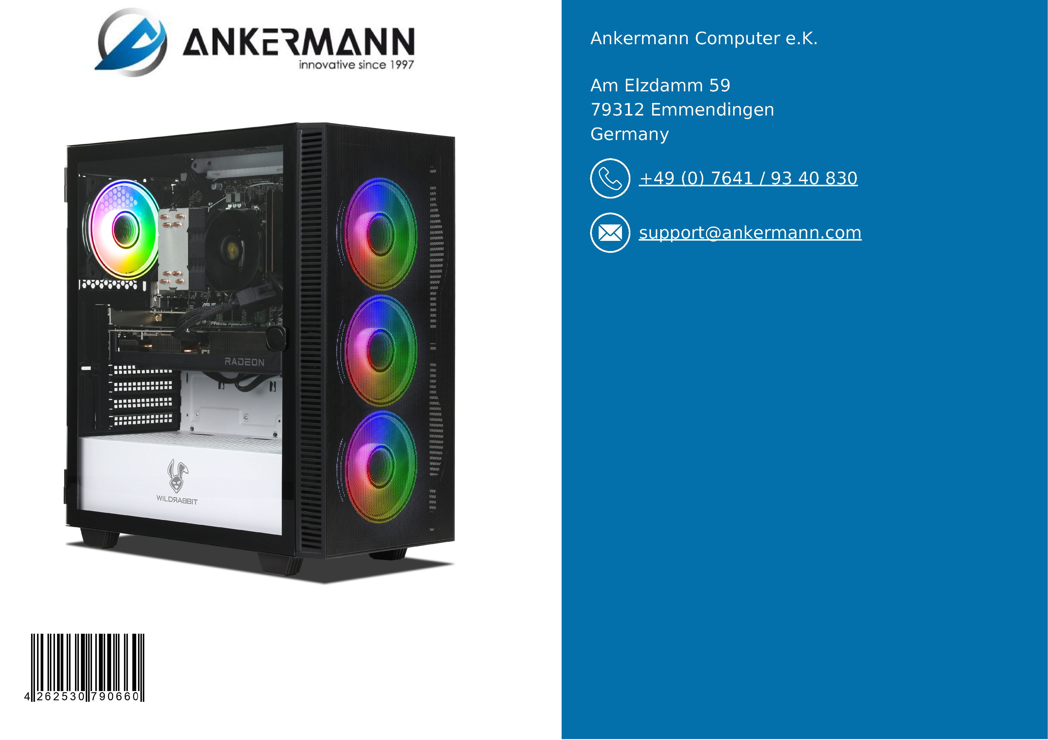 - Le service d'Ankermann vous offre une garantie de 24 mois et une longue expérience dans la fabrication et la distribution de PC en Allemagne et en Europe. Un service de retour en cas de garantie et un support client rapide et aimable sont naturellement à votre disposition.