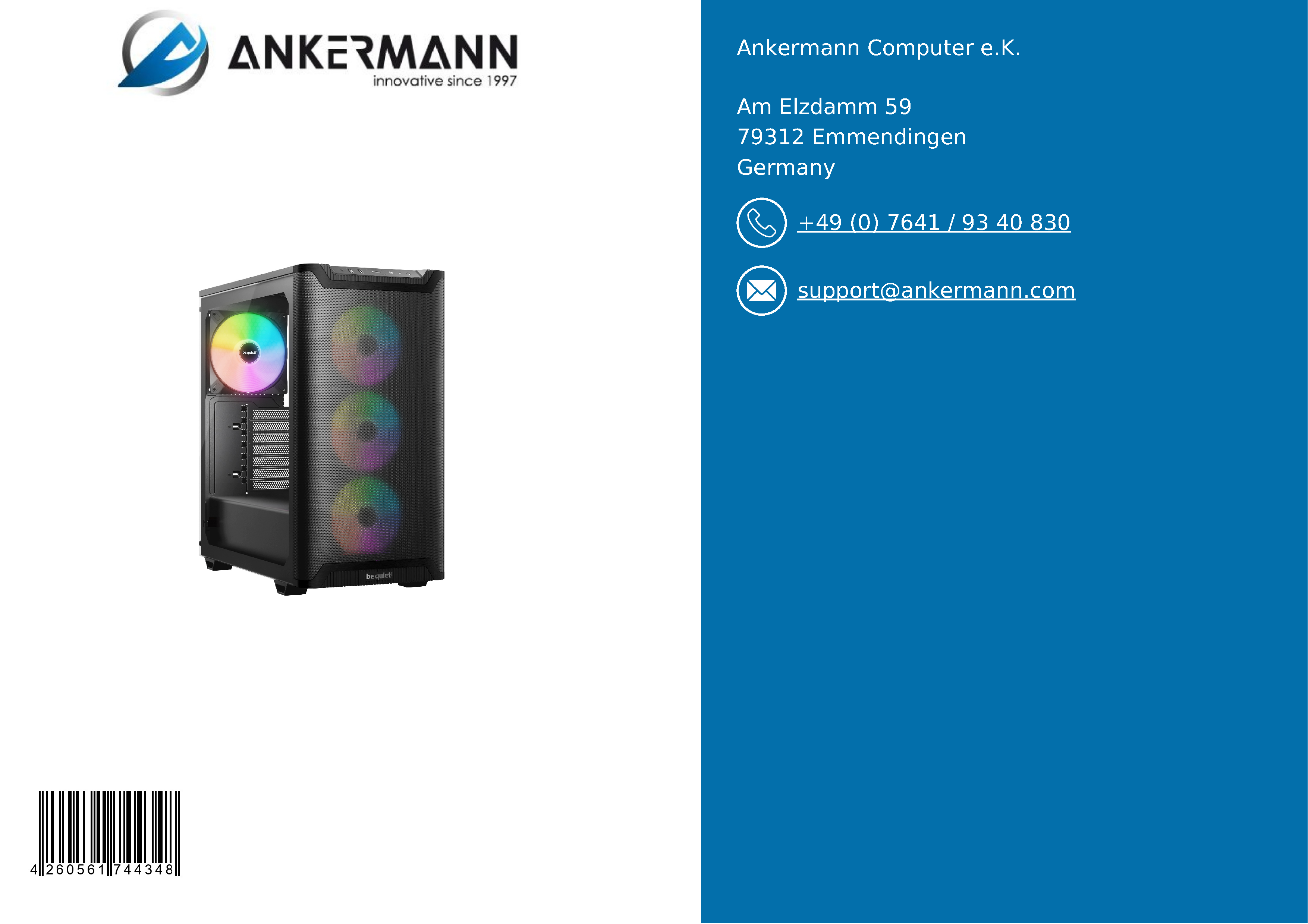- Le service d'Ankermann vous offre une garantie de 24 mois et une longue expérience dans la fabrication et la distribution de PC en Allemagne et en Europe. Un service de retour en cas de garantie et un support client rapide et aimable sont naturellement à votre disposition.