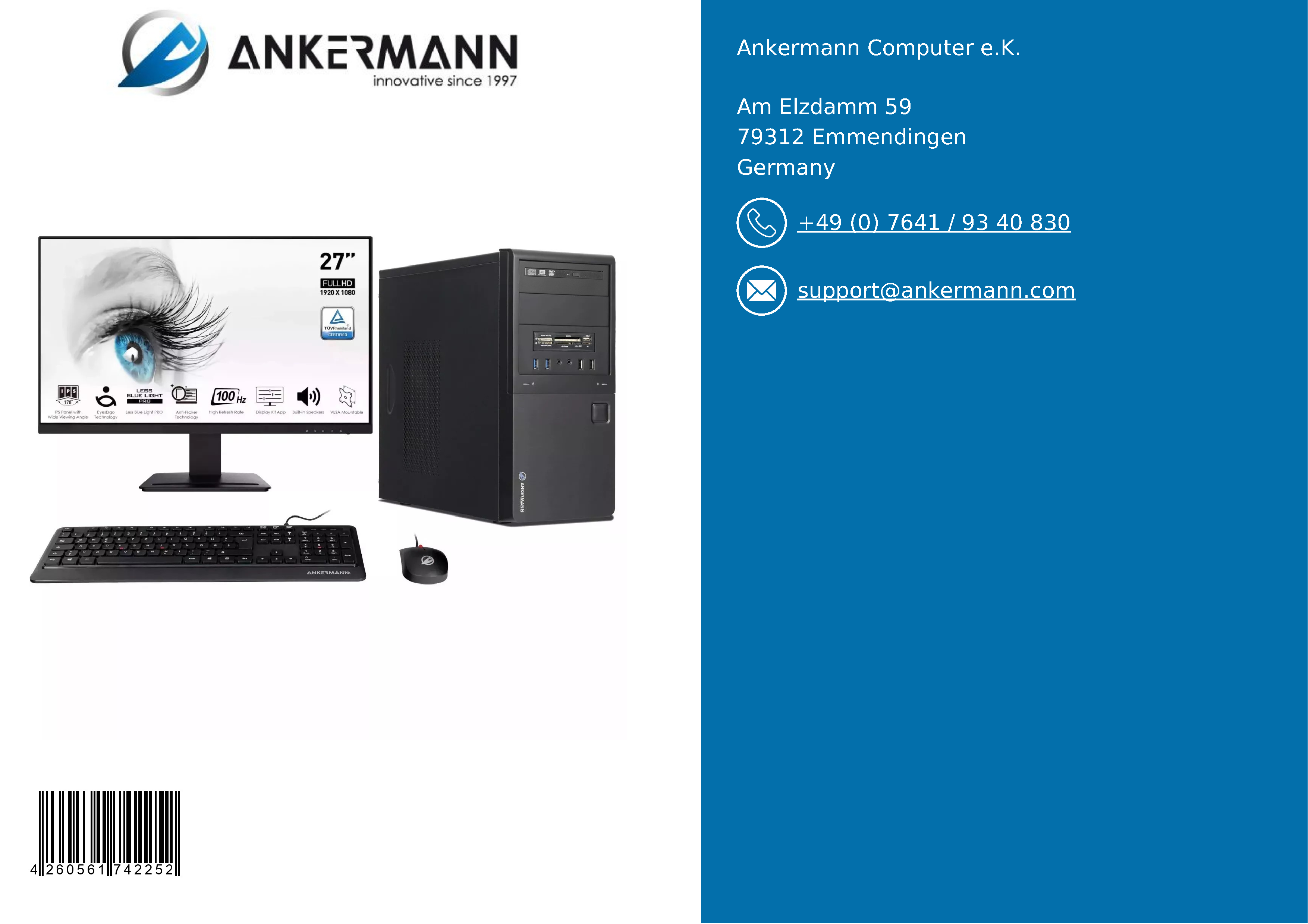 - Il servizio di Ankermann offre una lunga esperienza nella produzione e nella vendita di PC in Germania e una garanzia di 24 mesi. Sono inclusi 6 mesi di servizio di reso gratuito in caso di garanzia e un supporto clienti rapido e amichevole.