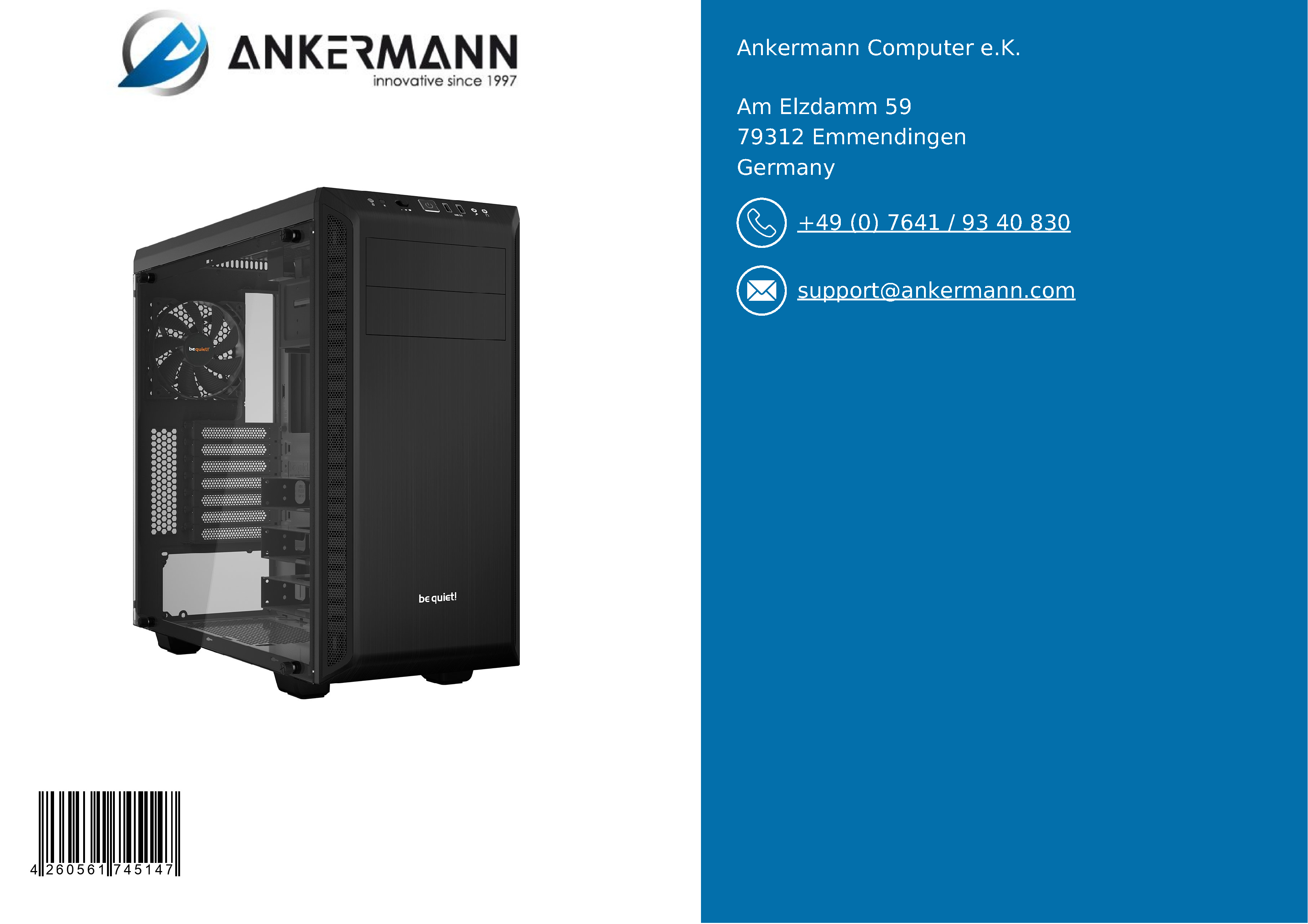 - Il servizio di Ankermann offre una lunga esperienza nella produzione e nella vendita di PC in Germania e una garanzia di 24 mesi. Sono inclusi 6 mesi di servizio di reso gratuito in caso di garanzia e un supporto clienti rapido e amichevole.